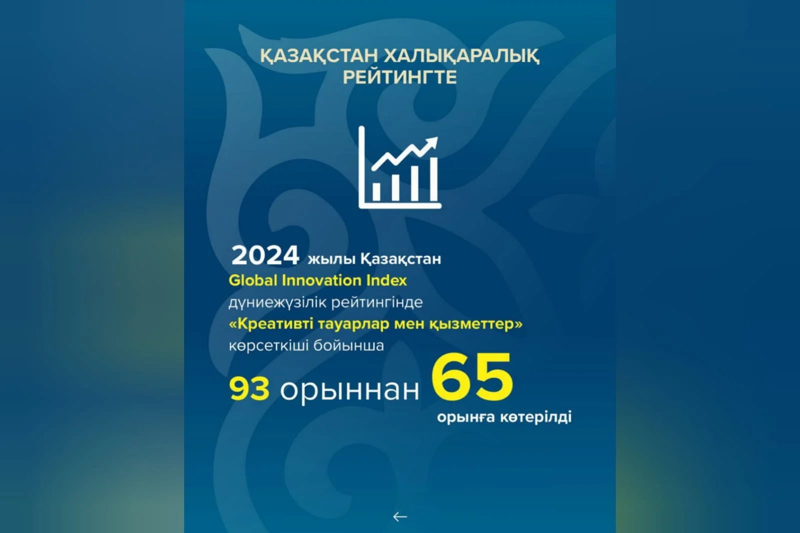 2024 жылы Қазақстандағы креативті индустрия саласы бойынша айтарлықтай жетістіктер болды. Атап айтсақ, ел Global Innovation Index-2024 халықаралық рейтингінде «Креативті тауарлар мен қызметтер» көрсеткіші бойынша 93-орыннан 65-орынға көтерілді. Бұндай серпінді өзгеріс жүйелі жұмыстар мен мемлекеттік қолдаудың нәтижесінде жүзеге асты.