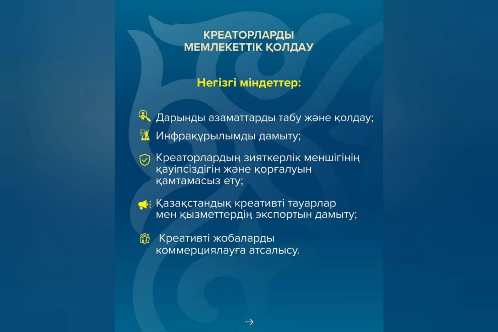Креативті экономиканы дамыту мақсатында Қазақстан Республикасы Мәдениет және ақпарат министрлігі арнайы шаралар пакетін әзірледі.