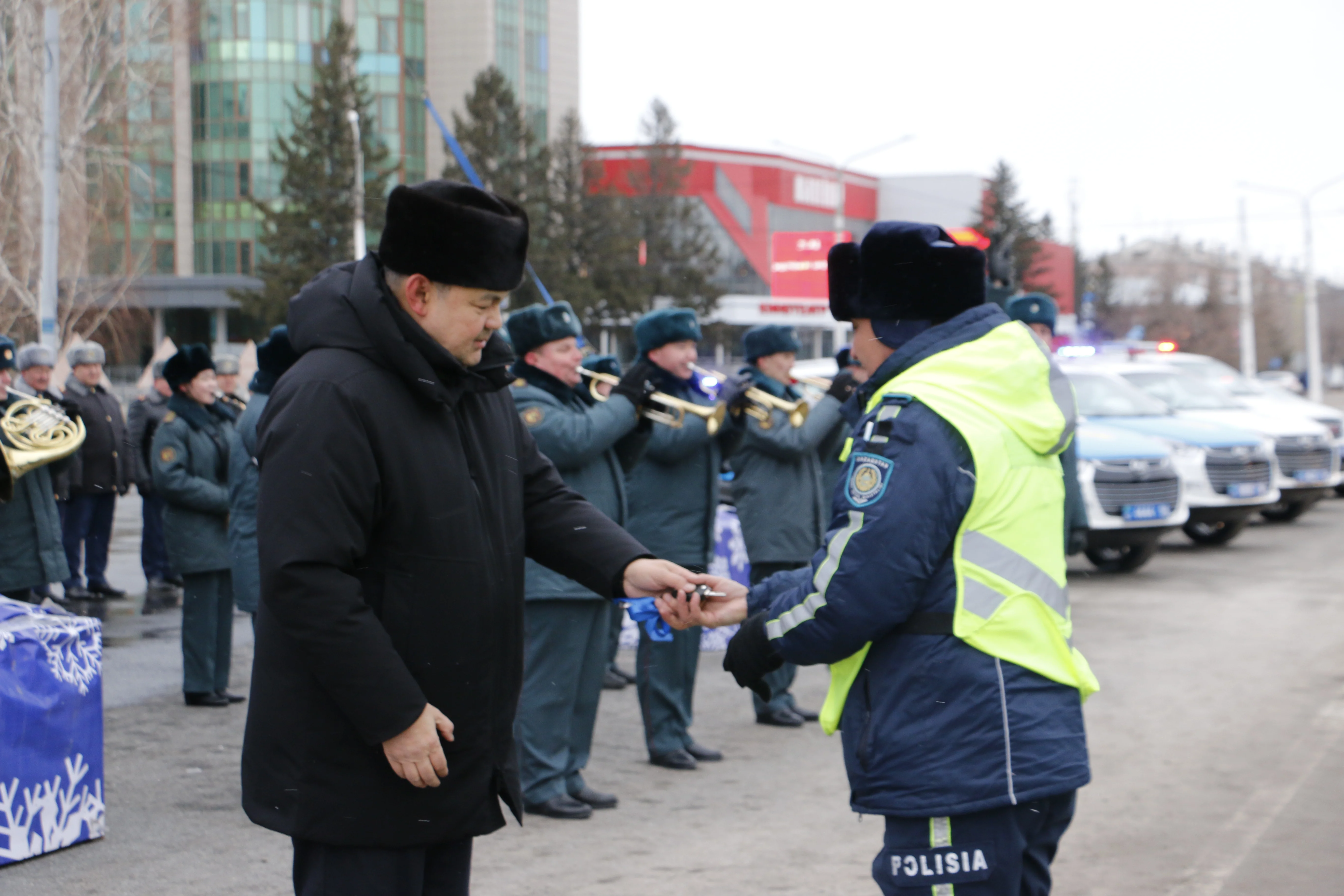 Өскеменнің орталық алаңында ШҚО әкімі Ермек Көшербаев полицейлерге жаңа көліктердің кілттерін салтанатты түрде табыс етті.