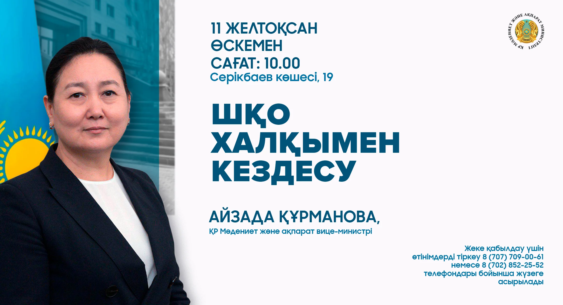 2024 жылғы 11 желтоқсан сағат 10.00-де Шығыс Қазақстан облысы Өскемен қаласы Д. Серікбаев атындағы Шығыс Қазақстан техникалық университетінің ғимаратында (Серікбаев көшесі 19) Қазақстан Республикасының Мәдениет және ақпарат вице-министрі Айзада Құрманованың халықпен кездесуі, оның шеңберінде азаматтарды жеке қабылдауы өтеді.