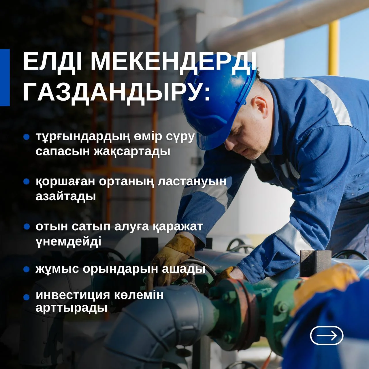 Елді мекендерді газдандыру халықтың өмір сүру сапасын жақсартып, экологияның ластануын төмендетеді, баламалы отын сатып алуға кететін қаражатты үнемдейді және өңірлердің инвестициялық тартымдылығын арттырады.