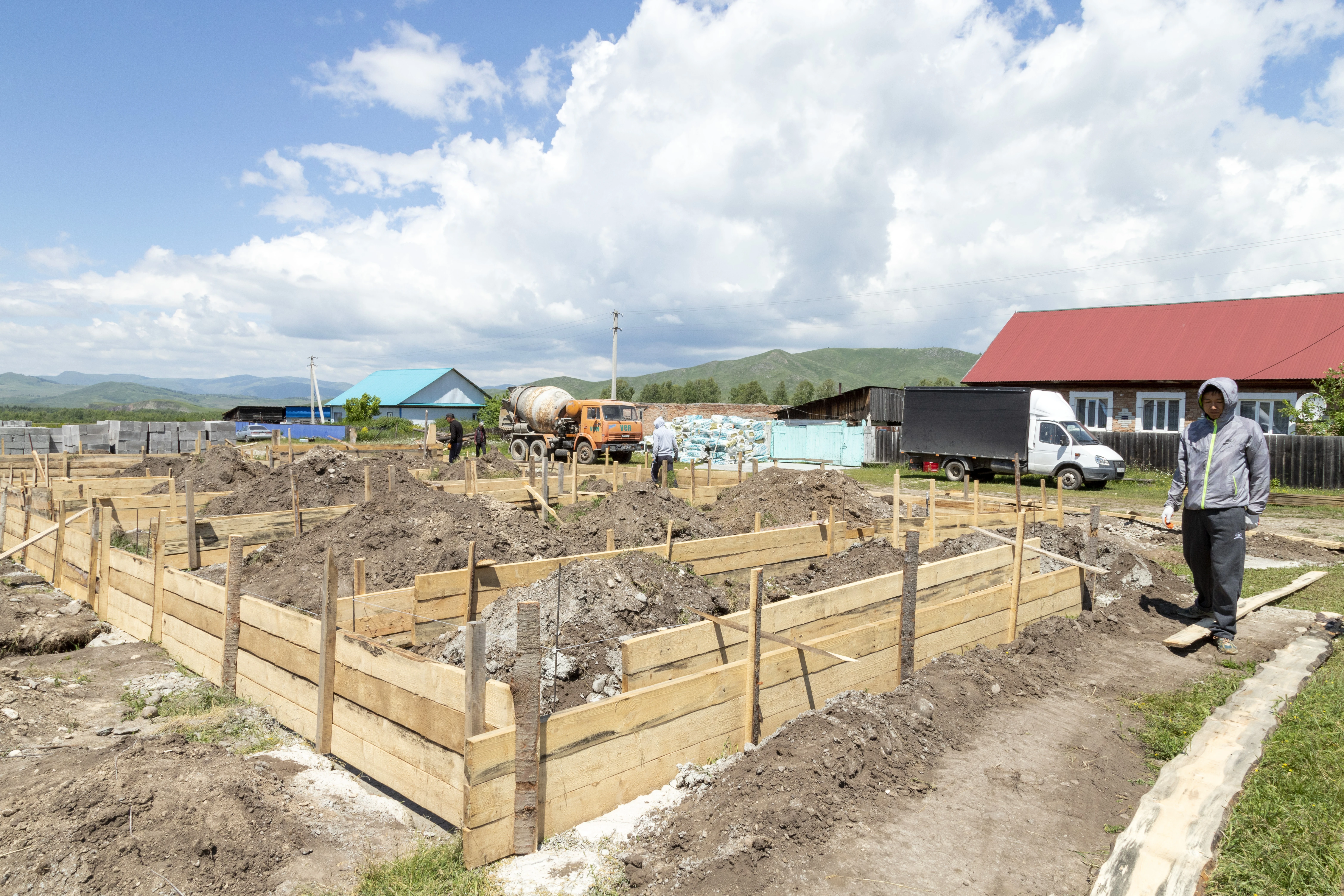 Сейчас на объекте уже завезены необходимые материалы: газоблоки, селикатные кирпичи, арматура, инертные материалы (гравий, песок и т.д.). В работе задействовано 10 человек и 3 единицы техники.