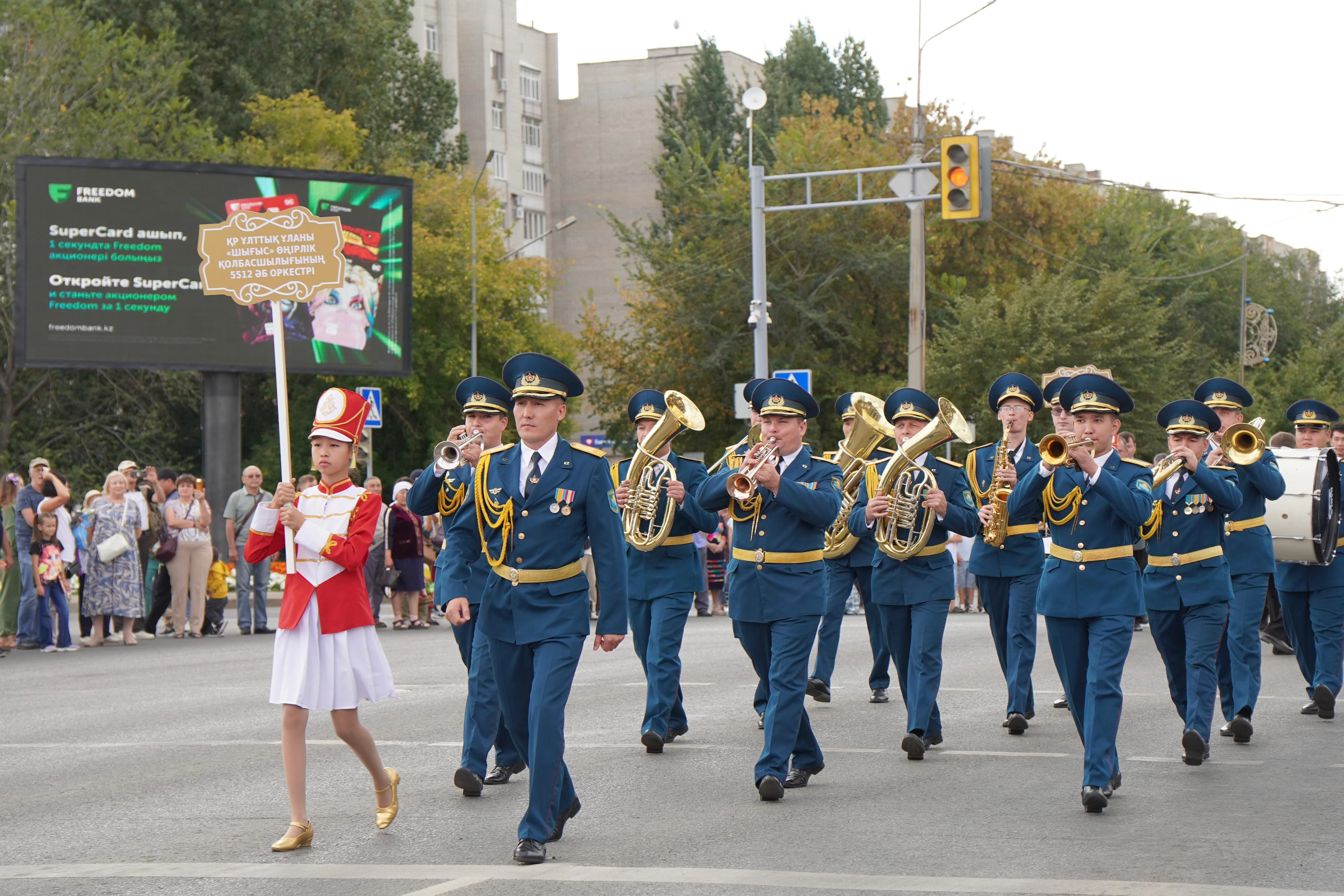 Парад возглавил Государственный духовой оркестр областной филармонии Республики Казахстан.